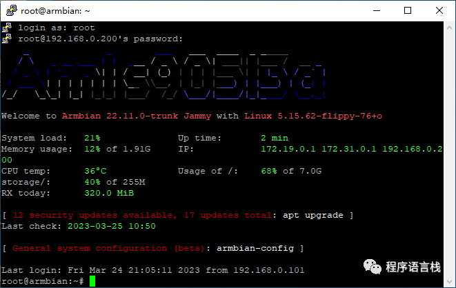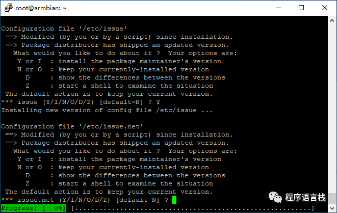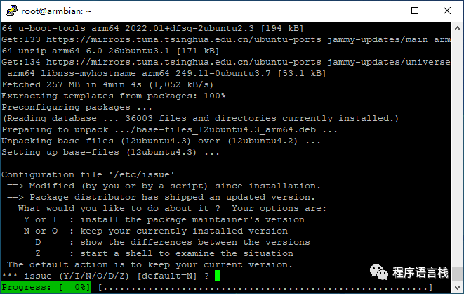由于用的是2022年发布是Armbian系统镜像,到现在很多软件都更新了,因此先进行软件升级。运行如下命令即可完成系统软件升级。软件升级过程中会出现三次选择项,均输入Y,如下图。