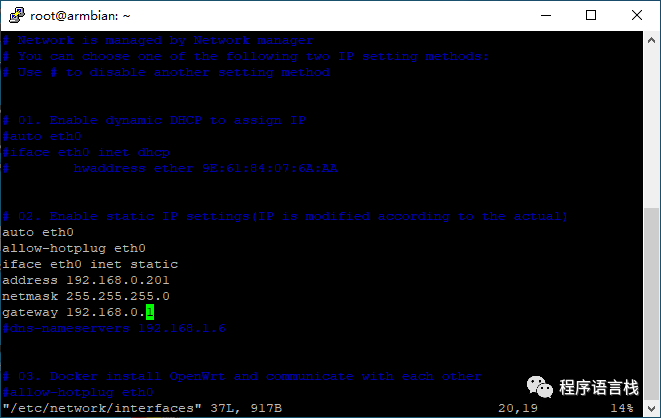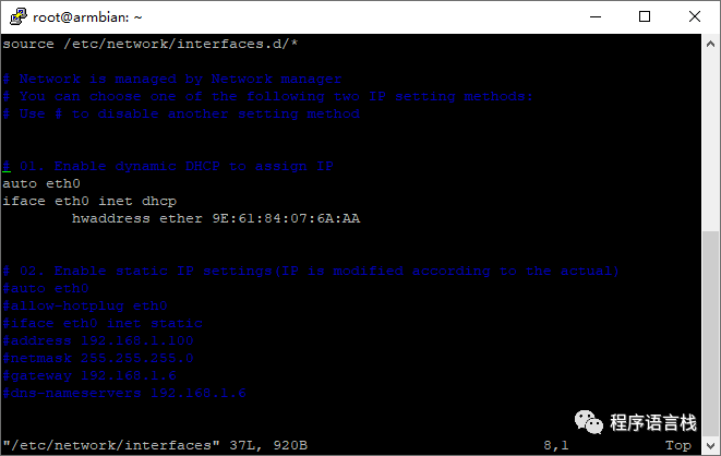 经过前面的五步操作,Armbian系统就已经配置好了,linux世界的大门已经打开。但还有一个小小的不便之处就是系统IP地址是自动获取的,关机后再次获得的IP地址不一定是上次的,为了方便后续使用,最好固定IP地址,不然每次SSH登录前都要去路由器界面查看系统IP地址。固定IP地址操作如下。命令行输入如下命令后,弹出下图所示界面。vim /etc/network/interfaces