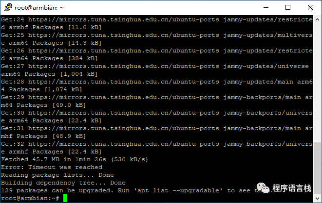 关闭WinSCP,回到刚才Putty打开的shell界面。在命令行中输入如下命令,完成软件源更新。完成后如下图所示。![]()