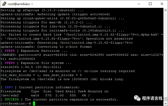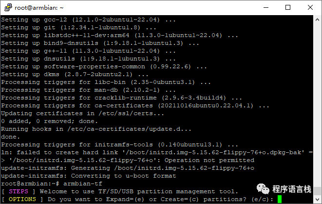 软件升级完成后,输入armbian-tf进行系统扩容,使系统能完全利用U盘剩余空间。扩容模式选择中输入e,直接扩容。![]()