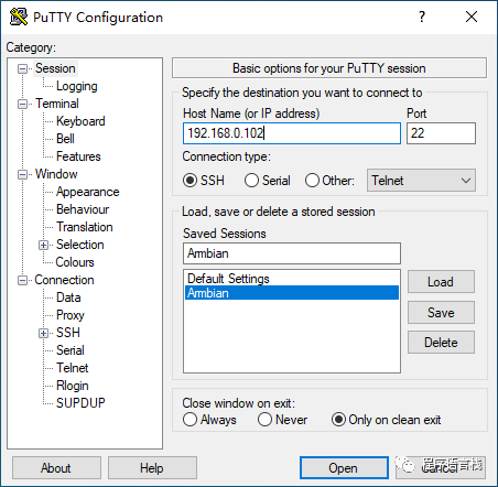 打开Putty客户端,Host Name输入电视盒子IP地址,Port输入22,点击Open。![]()