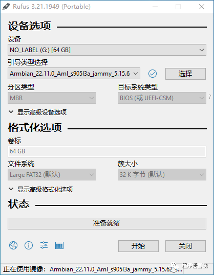 推荐使用Rufus刻录Armbian镜像到U盘中。按照下图进行设置,点击开始按钮进行刻录。![]()