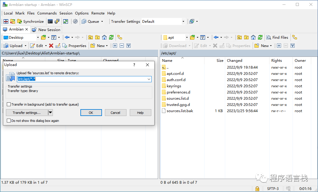 通过WinSCP登录到Armbian,将刚才创建的sources.list上传到/etc/apt/目录下。此目录中已有一个sources.list文件,可以覆盖该文件或者先将该文件重命名为sources.list.bak后,再上传新的sources.list。![]()