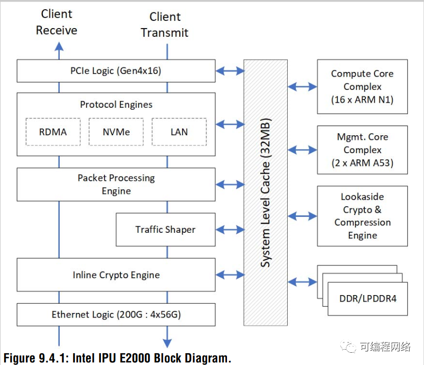 先看Intel的IPU E2000,功能分为左边网络子系统和右边的计算子系统。网络子系统由PCIe接口部分,RDMA,NVMe,LAN,可编程Packet处理流水线,inline加密,流量整形,200G MAC,56G SerDes组成。PCIe部分支持4个Xeon CPU,也就是说一个IPU可以接4台服务器。支持inline IPSec功能,就是不需要Host和ARM CPU的参与就能直接完成加密报文的处理。可编程的包处理流水线,支持200mpps的处理能力。计算子系统部分,包括了16个3.0Ghz的ARM N1的处理器,3个LP DDR4通道,一个加解密单元。另外还有一个管理单元,用来提供安全启动和芯片相关的管理功能。