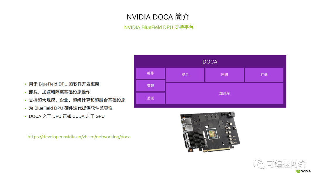 聊完了芯片硬件部分,暂时无法把这两个产品分出高下。芯片产业的另外一个更核心的竞争力,其实是软件的生态。黄教主一直宣称Nvidia是一家软件公司,CUDA就是GPU最核心的护城河。Intel和Nvidia也都在构建自己的软件生态。Intel打包了DPDK/SPDK等众多的开源软件,创建了IPDK社区。Nvidia也把DPDK作为核心组件,来构建DOCA。DOCA 之于 DPU 正如 CUDA 之于 GPU。但是众多的IPU/DPU用户是不希望被任何一个生态绑定。