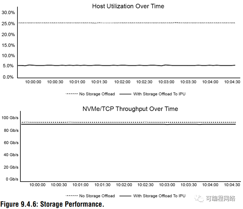 Intel的IPU的网络部分性能能跑到Theoretical Max Rate,这个应该是指200Gbps吧。对于64B的小包就能跑到线速,这个应该是很不错的结果。NVMe卸载的性能是接近100Gbps。