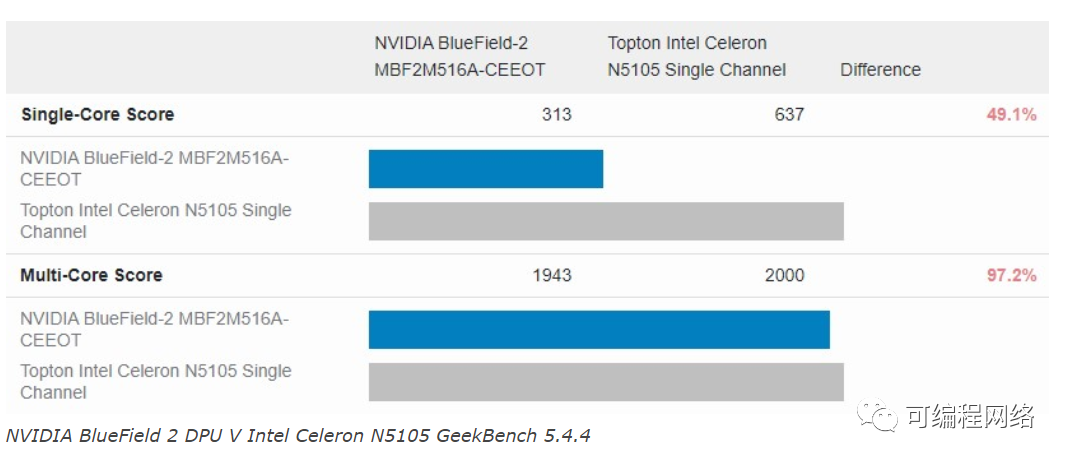 ServeTheHome也对比了Bluefield-2的ARM核的计算能力[5],8个A72核也就相当于4个Intel N5105(Jasper Lake Atom)的核。这也印证了Bluefield-2上的计算核心的算力不够的问题。