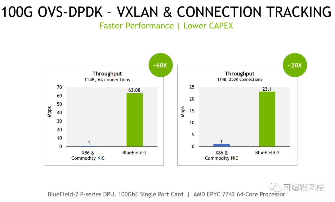 Nvidia没有公开提供的Bluefield-3的性能数据。只有Bluefield-2的OVS-DPDK的性能数据。图中用来对比的x86服务器是AMD Rome架构的64核的7742。感觉这个数据看起来有点夸张,不知道Nvidia用了几个Rome核来和Bluefield-2对比。![]()