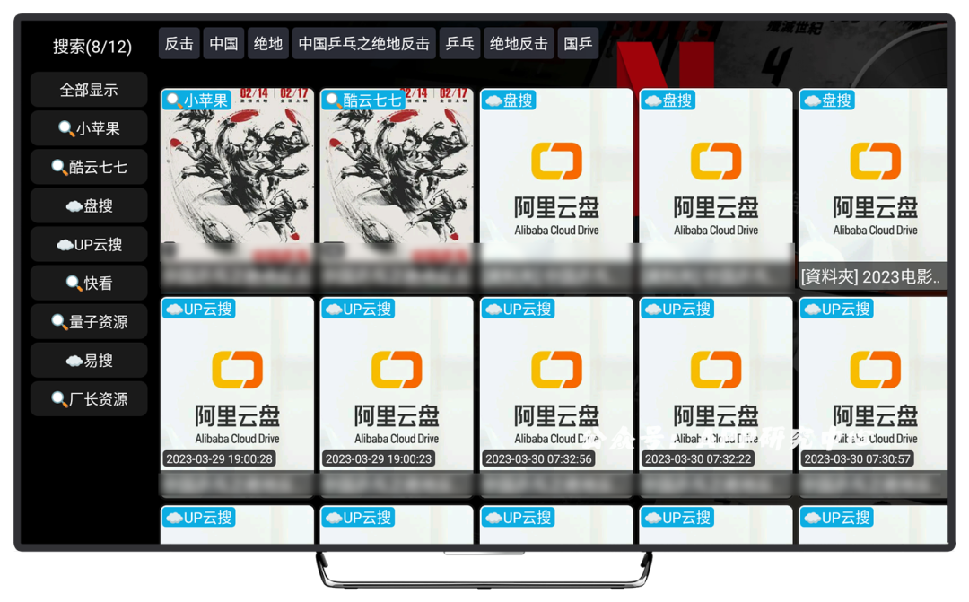 在APP首页,选择某个影视,可以长按OK键。进入全网聚合搜索界面,搜索该影视的全网资源,供你选择。