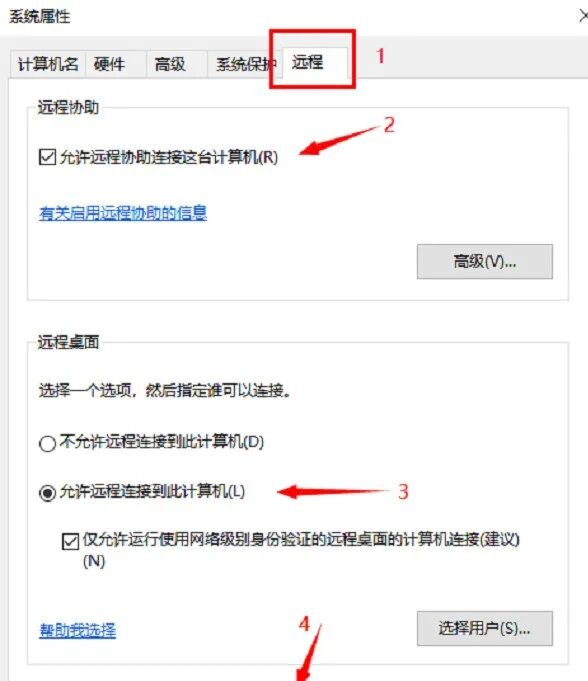 2、在弹出的系统属性中切换到“远程”选项卡,再依次点击下面的“允许远程协助连接这台计算机”和“允许运行任意版本远程桌面的计算机连接”,使其前面的方框打上对勾,再点击“应用”即可。