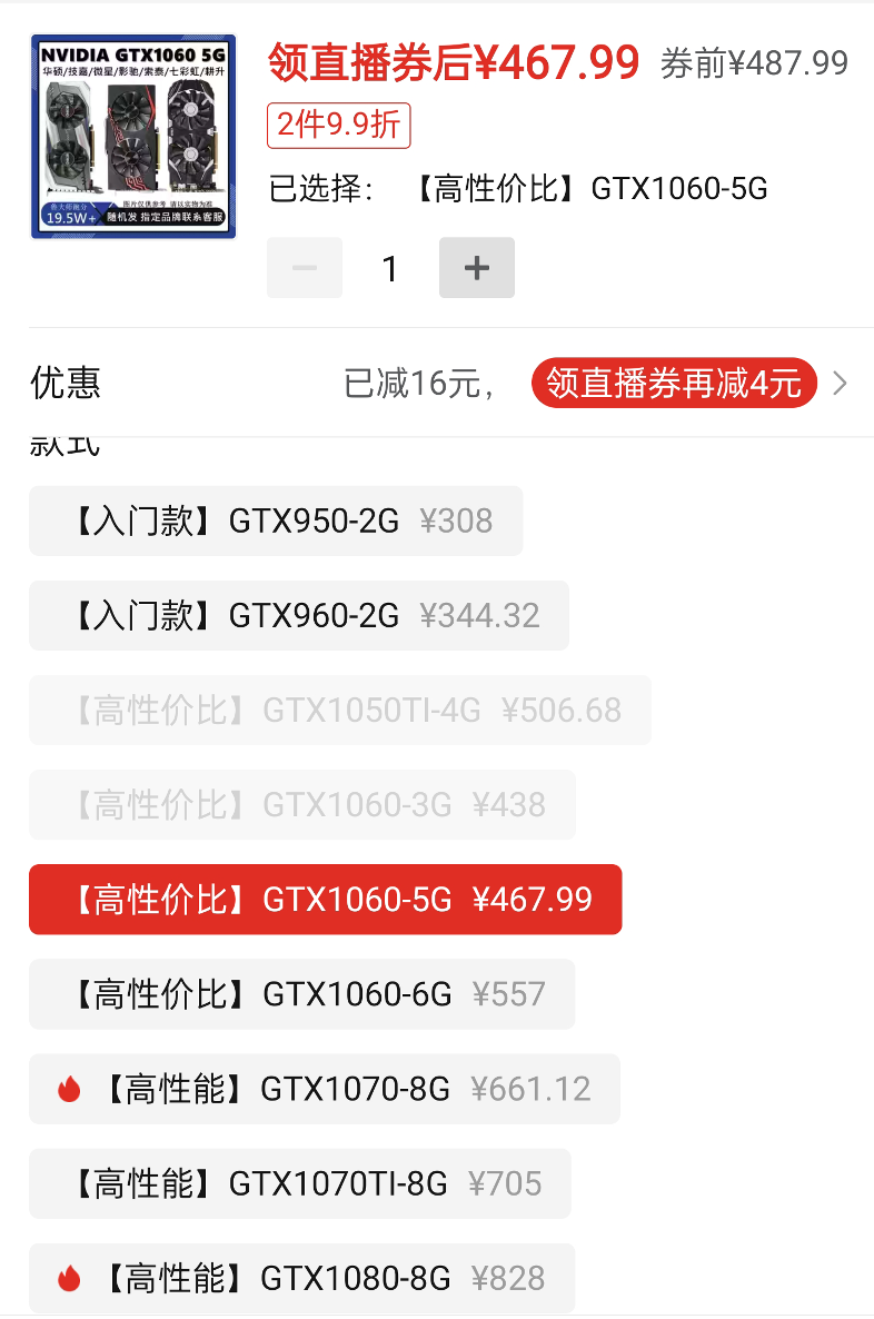 (某购物平台页面,随便搜的,二手GTX1060 5G显存 大概500左右)