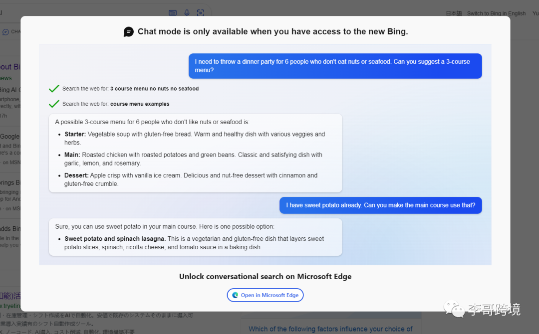 最近OpenAI的端口不是太稳定,很多IP都被Ban了,包括云服务器,在中美对抗的大背景下,以后日子只会越来越难过,不过李哥该薅羊毛一定都会薅,这里给大家分享一个不用注册也可以体验ChatGPT的方法。通过Bing的界面进入问答。