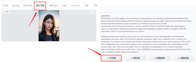 这时将一张带有关键词信息的图片拖到 stable diffusion 工作台的图片信息里,我们需要这张图片里的关键词信息,点击文生图,利用这些关键词生成图片。当然你也可以自己写一段关键词,因为我比较懒,所以就直接套用这张图片里的关键词信息了。
