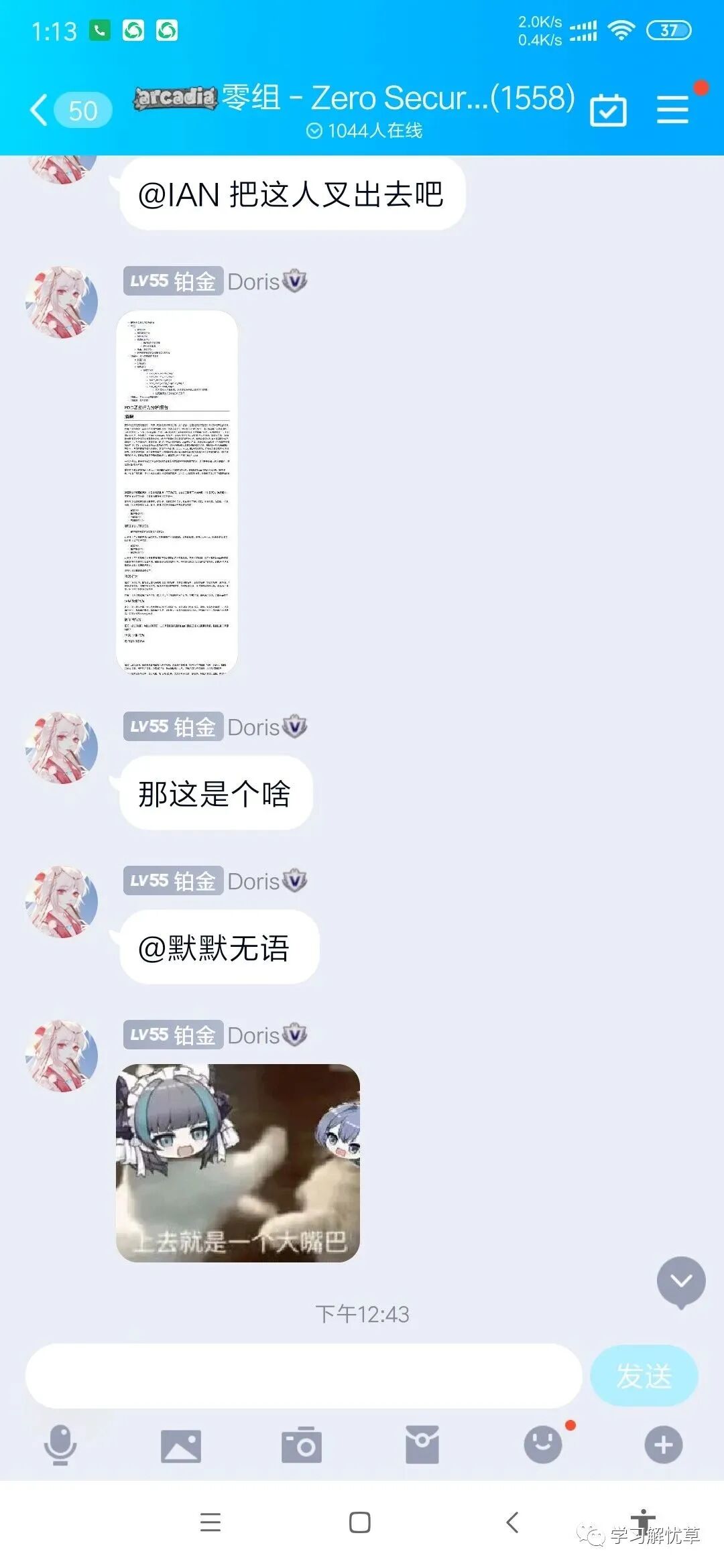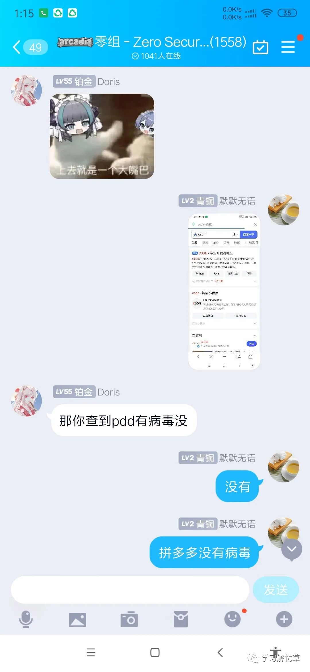 上个星期我在一个零组的信安群,问了下手机有木马,需要杀毒之类的吗,然后得到了如下的聊天回复