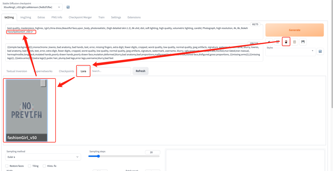 首先输入之前的 Prompt,然后根据下图中的箭头,依次点击红框中的内容,即可看到在上面 Prompt 输入框中,多了一个指令 <lora:fashionGirl_v50:1>,这个就是告诉 Stable Diffusion 使用 Lora 模型,并且权重是1,我可以调整为其他的值,例如 0.8。