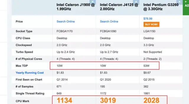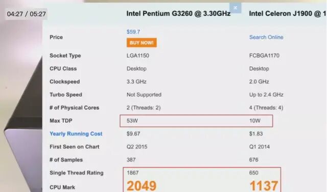 毕竟G3260设计功耗本就比J1900高上不少,一个10W的TDP,一个53瓦,差距有点大,当然,G3260功耗高,性能也比J1900强上不少。