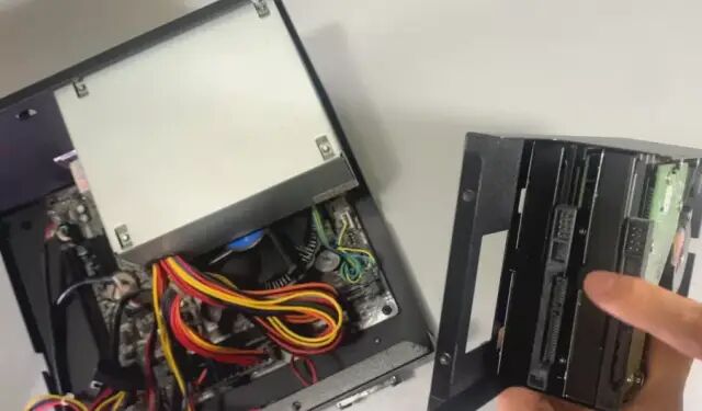 硬盘仓位置如下,原生可带2块3.5寸硬盘+1块2.5硬盘。
