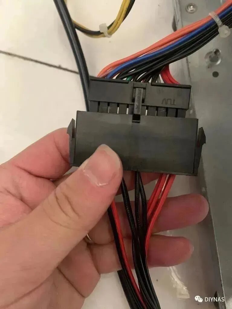 拿到所有配件后,我们先安转接电源,我们先把转接线的atx端连接到你机箱的atx电源线上,像下图: