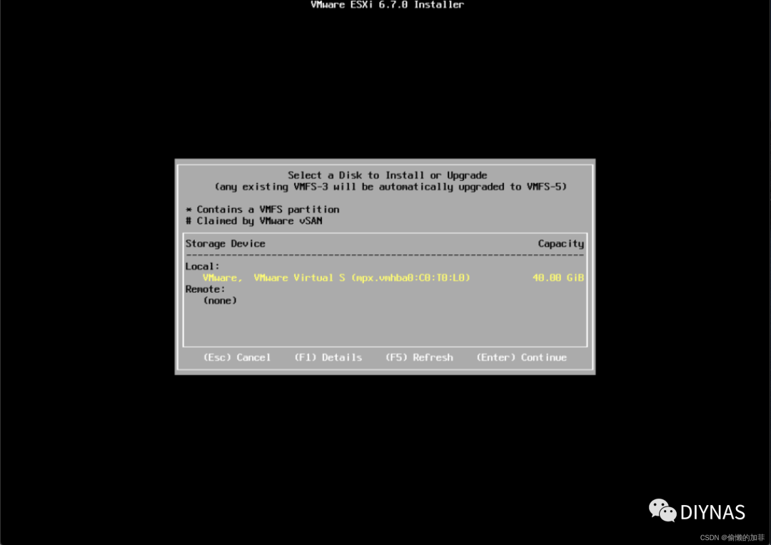 系统会自动检查可用存储设备,如果有需要,自己手动选择,按上下键,选中之后按回车继续,注意ESXI会格式化整个硬盘