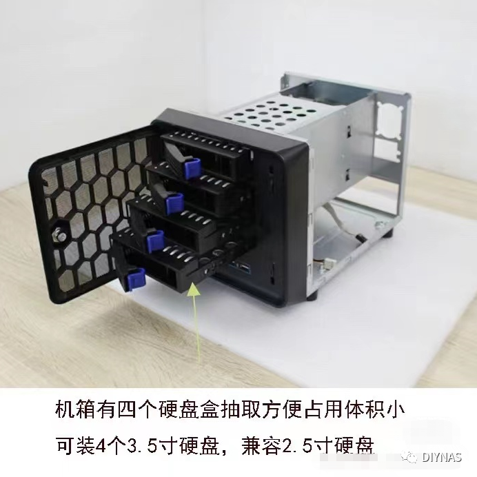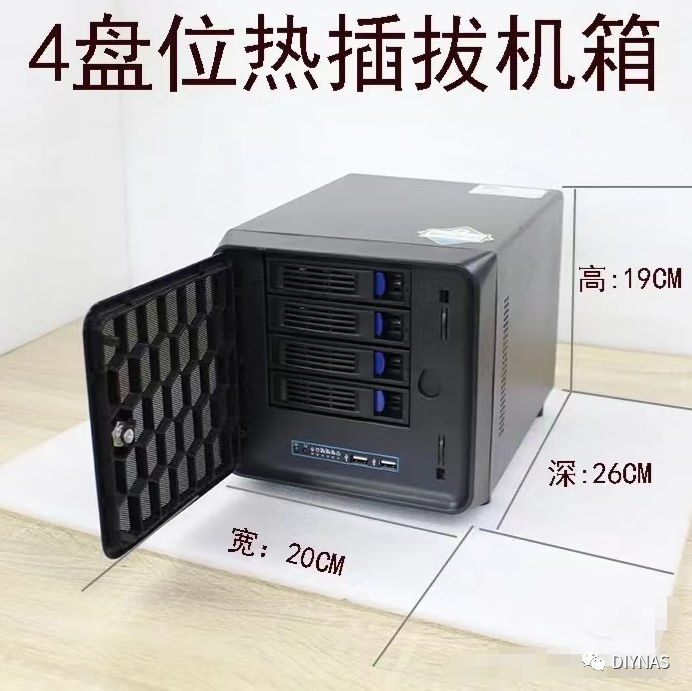 这款机箱是20*26*19的itx紧凑型NAS机箱,我们选择这一款机箱的原因即是它便宜,且还有不错的颜值,放在电脑桌上也不会太丑。我们来看看它的细节