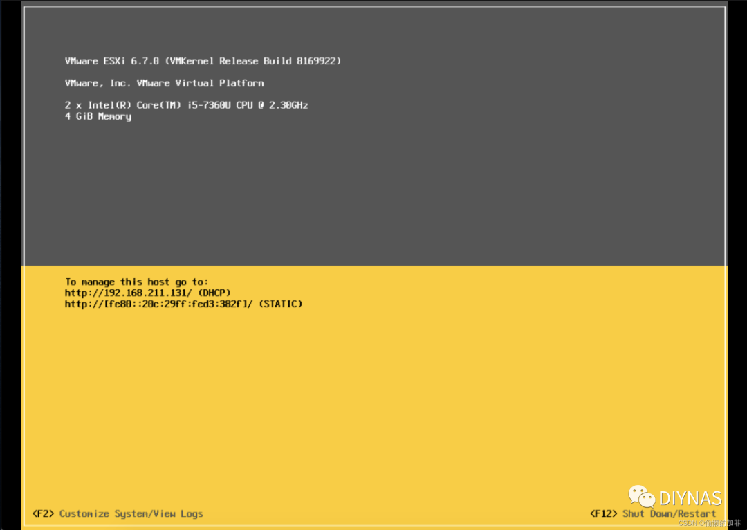 重启完成之后,就可以看到ip了,用电脑或手机浏览器打开ip即可进入esxi!