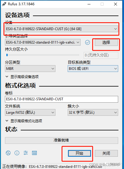 安装下图选择好U盘和esxi系统镜像,然后点击开始写入U盘(会格式化U盘,请保存好资料)