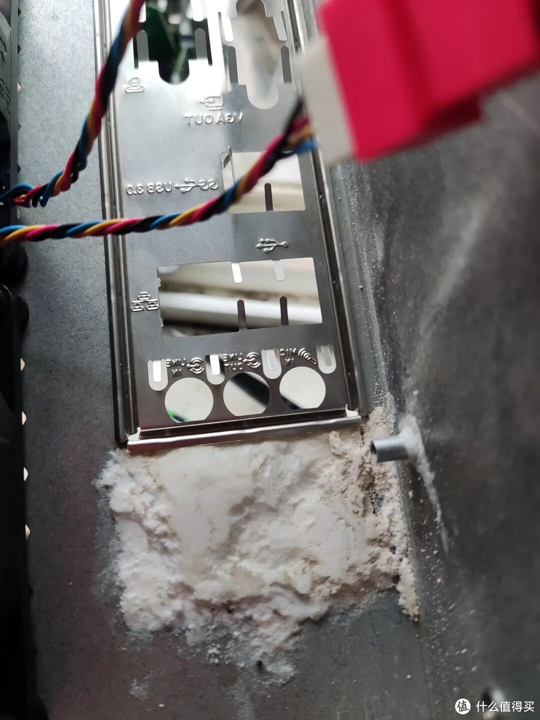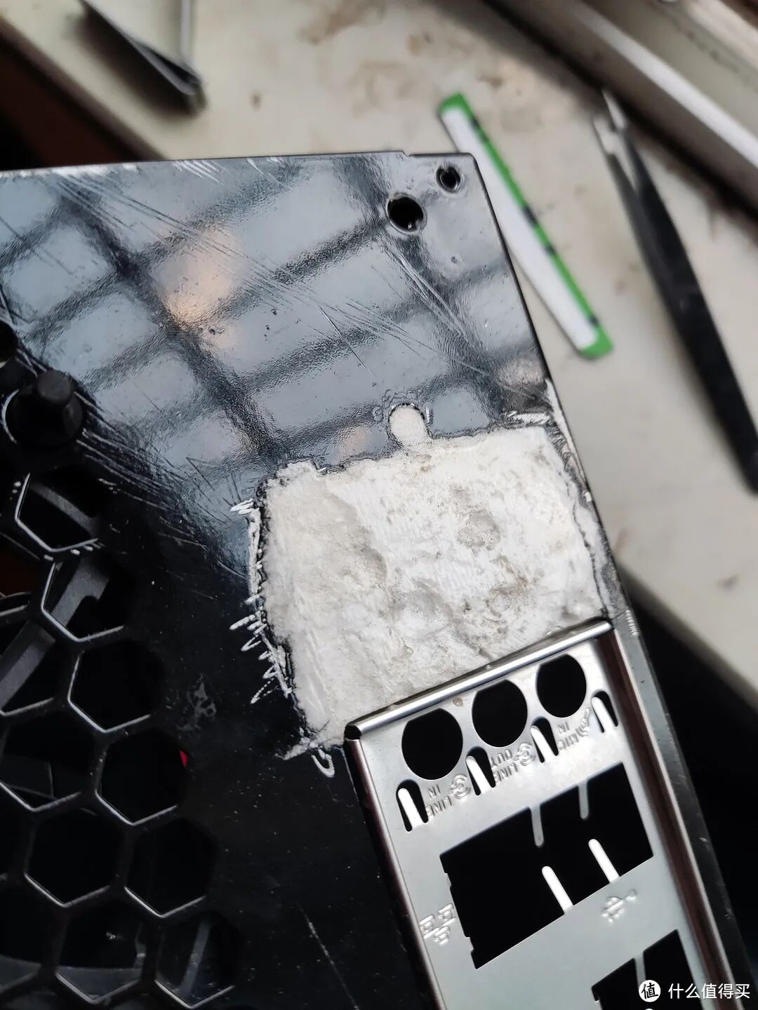 502加小苏打的原因是强度高,易操作,固定个主板绰绰有余,锉刀打磨我没注意,和板子接缝还是裂了,毕竟才一毫米厚,背面将就用。。