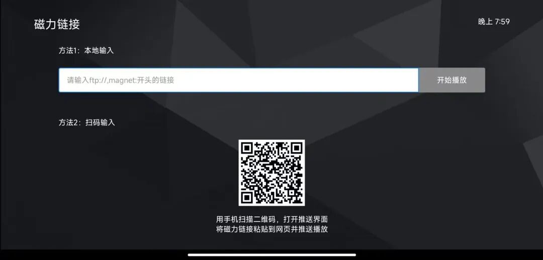 可以手动输入磁链,当然电视不方便输入,那么我们可以用手机扫码推送到电视上,实测播放也非常流畅,小棉袄看源码它应该是用的迅雷SDK,所以大多数资源都能流畅播放