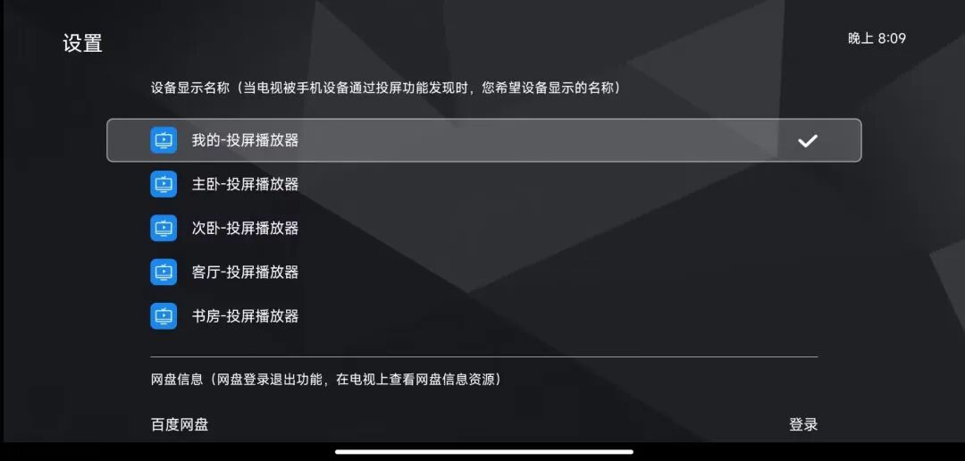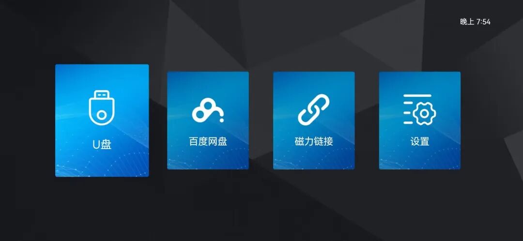 它的首页就有U盘、百渡网盘、磁力链接和设置四大模块,U盘就不用多说了,就是它可以播放电视上插入的U盘里面的视频文件,而百渡网盘就是它可以登录度盘账号,播放度盘里面的文件