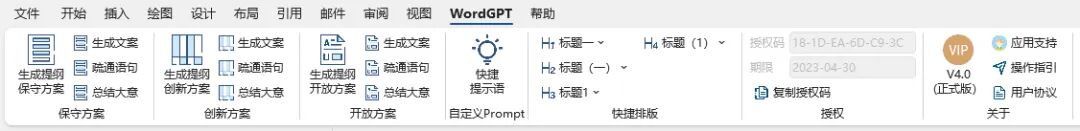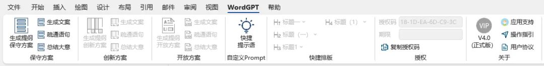 (1) 一个授权码只可绑定一台电脑,如有多台电脑,请确定常用电脑,无法更换电脑使用;(2) 一台电脑上同时使用WPS和Office,只需选择其中之一进行授权即可,另一个自动获得授权。(3) 授权开通时间:工作日9:00~22:00,其他时间可能会有延迟(4) 此授权方案为过渡阶段临时方案,后期随时会有调整 保守方案:秉持传统观念和做法,追求稳定和秩序,表达方式较为保守、传统,缺乏新颖和创新的元素。适用于历史、文化等相关的创作,强调对传统的尊重和维护,但也容易陷入千篇一律的模式,缺乏创意和个性。创新方案和开放方案注重突破传统思维和表达方式,表现出个性化、创造性的特点。创新方案:尝试打破常规,从新的角度去审视问题,采用新的写作手法和语言风格,体现出新思维和新文化的元素。开放方案:强调与读者的沟通和交流,注重吸收多元化的文化和思想,表达方式多样化,具有包容性和开放性。从保守方案到创新方案、开放方案,生成方案从聚焦到发散,内容呈现上逐步丰富,可开放思维,打开不同的写作视角。可以根据自己的喜好选择生成的模式。![]()