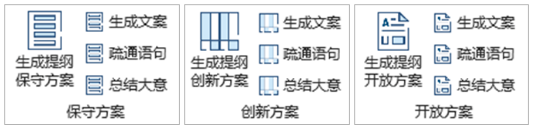 通过选中Word中的多个关键词或关键语句进行生成提纲,语句内容简洁明确,能清晰表达出核心诉求。(2) 点击【生成提纲】功能按钮,可根据实际需要,选择保守方案、创新方案、开放方案3.3. 生成文案