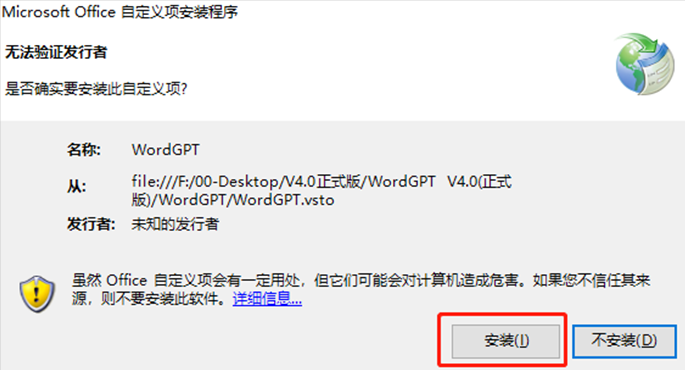 适用于Windows系统,暂不支持macOS、Linux;推荐使用Win10,office2012以上版本,WPS最新版本;关注微信公众号,获取最新安装包,软件更新会第一时间通过公众号号推送。点击公众号底部菜单栏“WordGPT”或回复“WordGPT”,均可获取最新安装包安装链接及教程。安装包下载链接采用百度网盘、夸克网盘,可按需进行选择。2.2. 软件安装