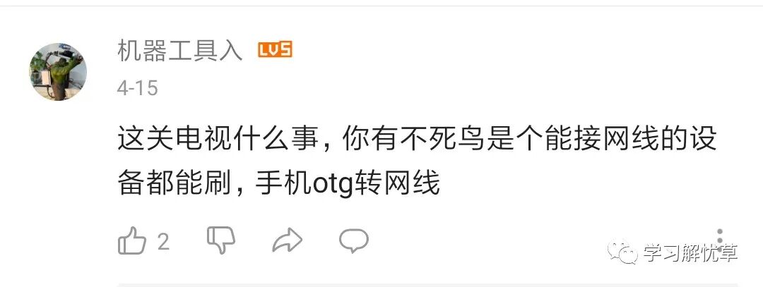 有个这样的评论,其实我分享这些刷机方法,不管用手机刷,还是用电视机刷,其实都是为了降低大家刷机的门槛,当你想刷机时,身边没有条件,没有电脑,没有手机,还可以用电视刷,只是为大家提供方便,也是为了说明刷机的多样性,对我来说没有高下之分,难道用1万的电脑和几百元的主机刷,有什么区别吗,刷机就是刷机有朋友问为什么不用电脑,直接连接路由器,像上面评论里说的,有些路由器不能直接连接电脑,连接了是识别不了,所以通过路由器中转下,就可以用电脑刷机了评论里说的刷机方法比较简洁,开始不太懂,电脑一直识别不了进入breed的路由器,输入192.168.1.1,没有反应,后来才发现,必须要让被刷路由器先进入breed,然后再连接另一个路由器,接入电脑,电脑就会识别了,就像视频里的顺序,这样成功率高点第一个视频是小米r1d lan口 连接 k2p lan口第两个视频是小米r1d lan口 连接 k2p wan口路由器我测试了很多接法,网线一头是lan口,另一头怎么接都能识别,小米r1d wan口连接k2p wan口,没有反应,会识别不了有意思的是视频里小米r1d路由器,其实里面并没有装系统,通过网线,连接到电脑,只要电脑有刷机环境,就能给k2p刷机用手机怎么给路由器刷机教程,这篇是我前两个星期看见的,就是我的第三段视频的刷机方法,不管是电脑和手机,连接中介路由器的网络,是为了识别被刷路由器这些路由器刷机方法都让我想到了,云电脑刷机,感觉差不多,都是三要素,主机+路由器+breed路由器,云电脑+otg手机+被刷手机,其实我想说现在这时代软件和硬件并没有区分的很明显,在后PC时代,一切都可能是"PC",并不是只有电脑才是PC,很多东西都能刷机我觉得breed路由器刷机需要的环境就是 “浏览器+文件管理器”,只要有这两个条件,设备有网口,都可以给路由器刷机试试,我分享的这期视频也补充了玩法,要是没有浏览器和文件管理,还可以分享热点用手机刷其实这种刷机方式一直都有,只不过没人制作教程分享出来,我比较折腾,发现了这些玩法,有空制作了视频出来,觉得我的文章和教程,对你有用的话,就关注我,了解更多刷机方法