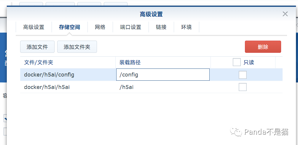 随后我们在docker中新建文件夹h5ai,再在下面分别新建h5ai与config文件夹用于后面的映射设置。映射路径分别为/h5ai与/config。(其中/h5ai路径为文件共享到web的路径)