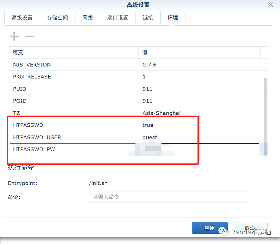 如果你需要给访问界面设定一个用户保护,那么在环境变量中将HTPASSWD设置为true,并添加一个环境变量HTPASSWD_USER与HTPASSWD_PW,值变为你设置的用户名与密码即可。