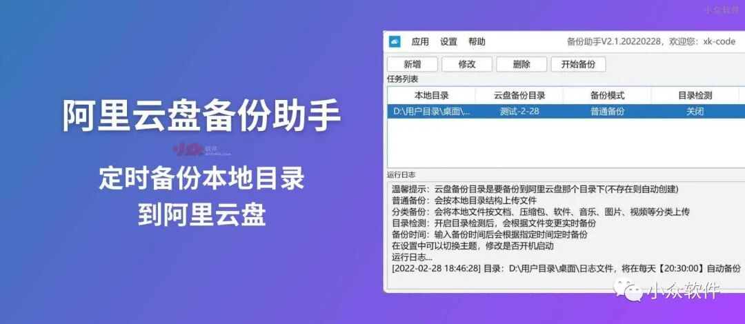 阿里云盘备份助手是一个可以定时备份本地目录文件到阿里云盘的小工具,支持 Windows、macOS、Linux,支持自动检测新增文件自动上传、定时上传。@Appinn