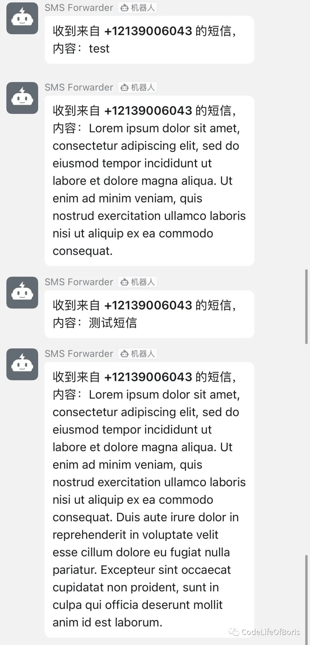 等板子初始化完成之后,就可以给这个手机号发短信了,板子收到短信后就会把发信号码和短信内容发送到配置的通知通道。开发的时候我已经测试过普通短信、长短信、中文、英文、日语,都可以正常接收。