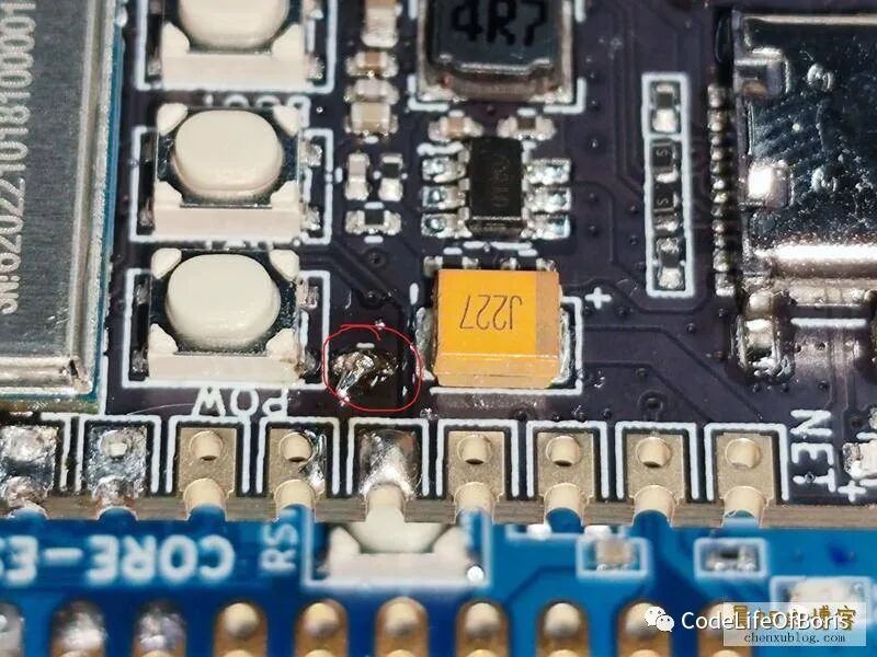另外因为Air780e默认不会上电自动开机,所以还要把PWR键上方的焊盘短接来让它通电就自动开机。(暂且借晨旭的博客中的图片,因为我焊的时候忘了这茬了……)