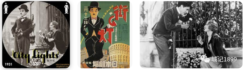 看到这几幅那个时代特有的海报剧照宣传照片时可能大家都是会想起来了吧,那个流浪汉和卖花姑娘,一个盲人之间的故事。(顺便赞扬一下中文的翻译之美,在日本这部影片被翻译成为“街上之灯”,即使到最近日本也有纪念活动比如电影重演,剧本改编再现等等,依然在使用“街上之灯”的名字,而我们国内一直是在用城市之光这个译名。)