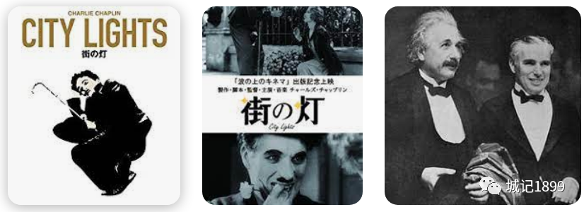 上面图片中的最后一幅画面是爱因斯坦出席电影《城市之光》的洛杉矶首映式的时候和卓别林的合影,此时这个影片已经通过新闻报道等等为世界所知,那之后卓别林又去巴黎举办了欧洲首映。