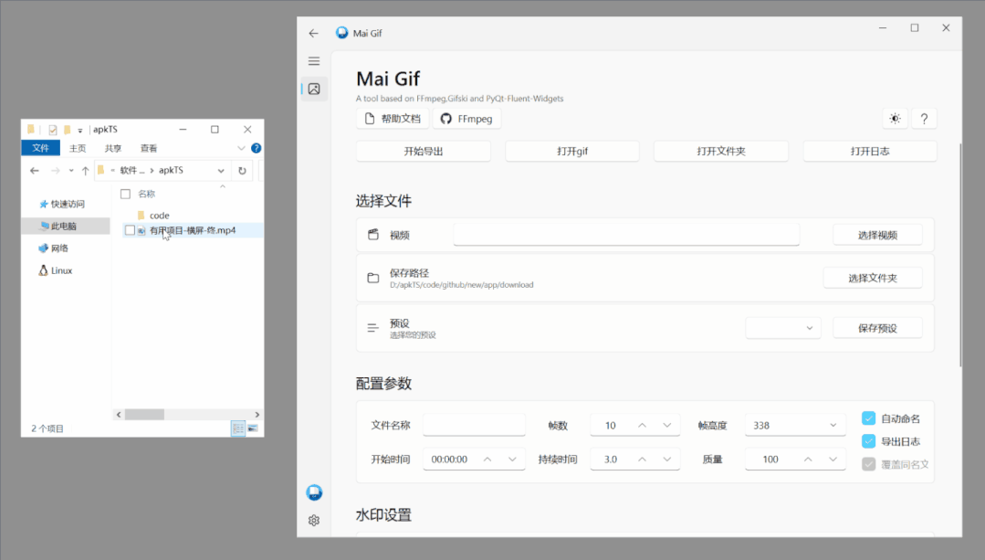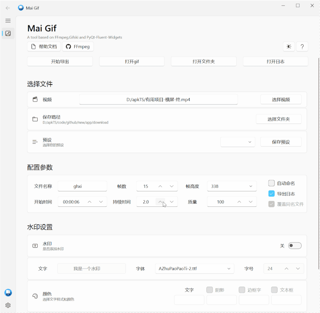 在前期看需要的时间数据时会花点时间,但是在导出环节就很快,另外还可以使用预设加快速度,一般情况下截取的动图是有固定格式的,会随着实际上传图片的地方来进行调整,Mai Gif提供了保存预设的功能,这个适合下面的水印功能设置是连在一起,也就是说可以保存多套水印。