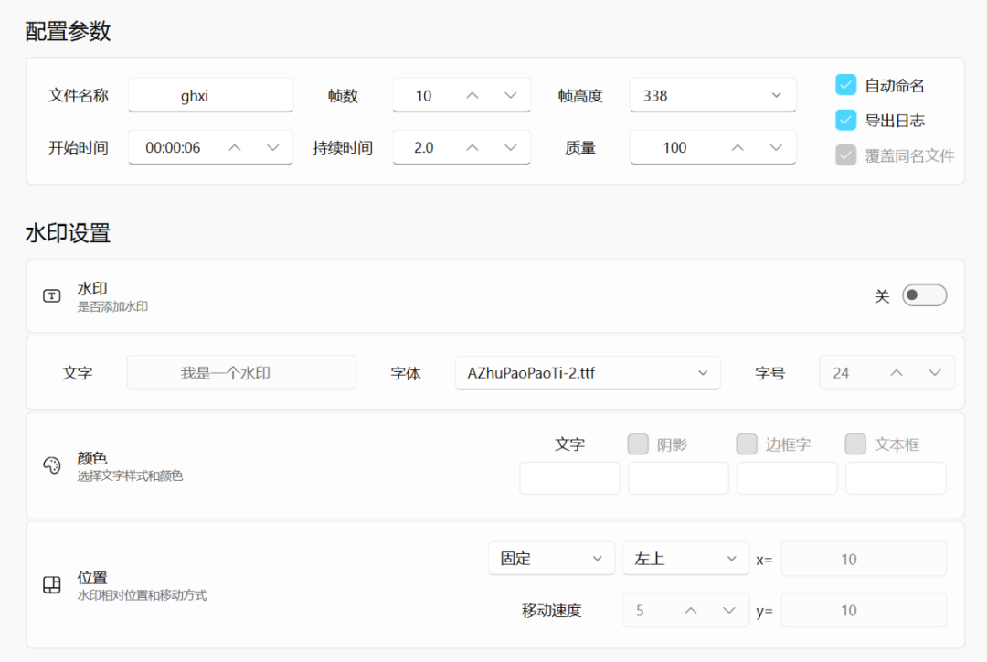 设置字体与大小和颜色、边框与阴影、自定义水印移动方式等: