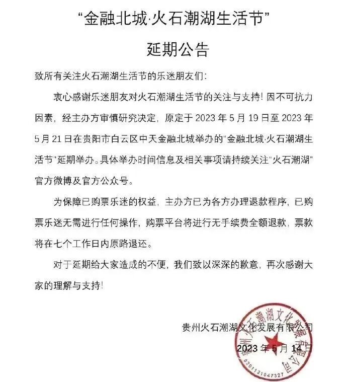 就在昨天,阵容不错的“金融北城·火石潮湖音乐节”主办方也发出了延期公告,依旧是“因不可抗力因素”。
