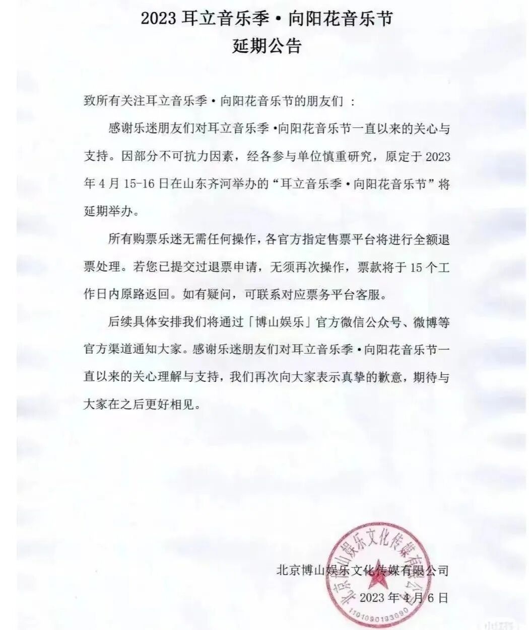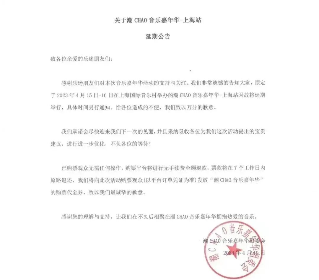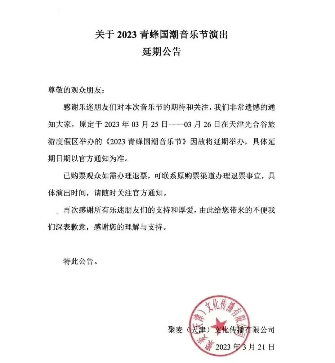 就在这两次延期公告发出后不到半个月的时间,原定于3月25日——3月26日在天津举办的“2023青蜂国潮音乐节”,主办方也在3月21号发出了延期公告。