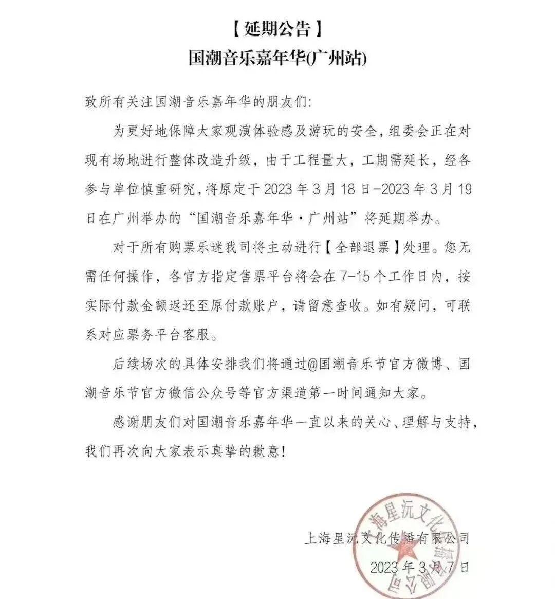 还有原本定于3月18日-2023年3月19日演出但延期的“国潮音乐嘉年华·广州站”。