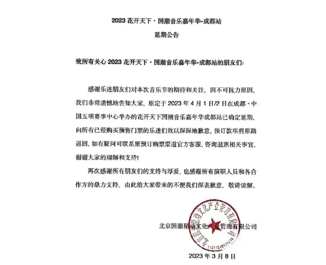 原定于4月1日——4月2日的“花开天下·国潮音乐嘉年华-成都站”,也官宣延期。