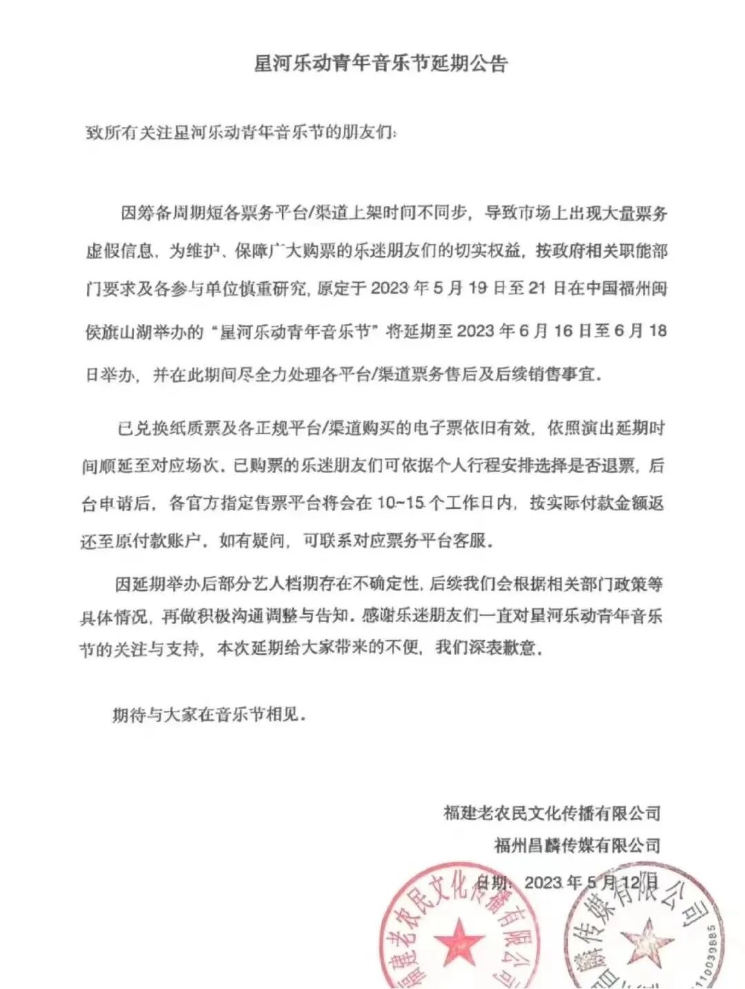 无独有偶,星河乐动音乐节也是原定的5月演出,在12号发出通知将延期到6月中旬演出。