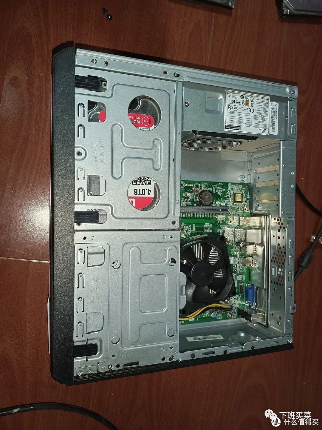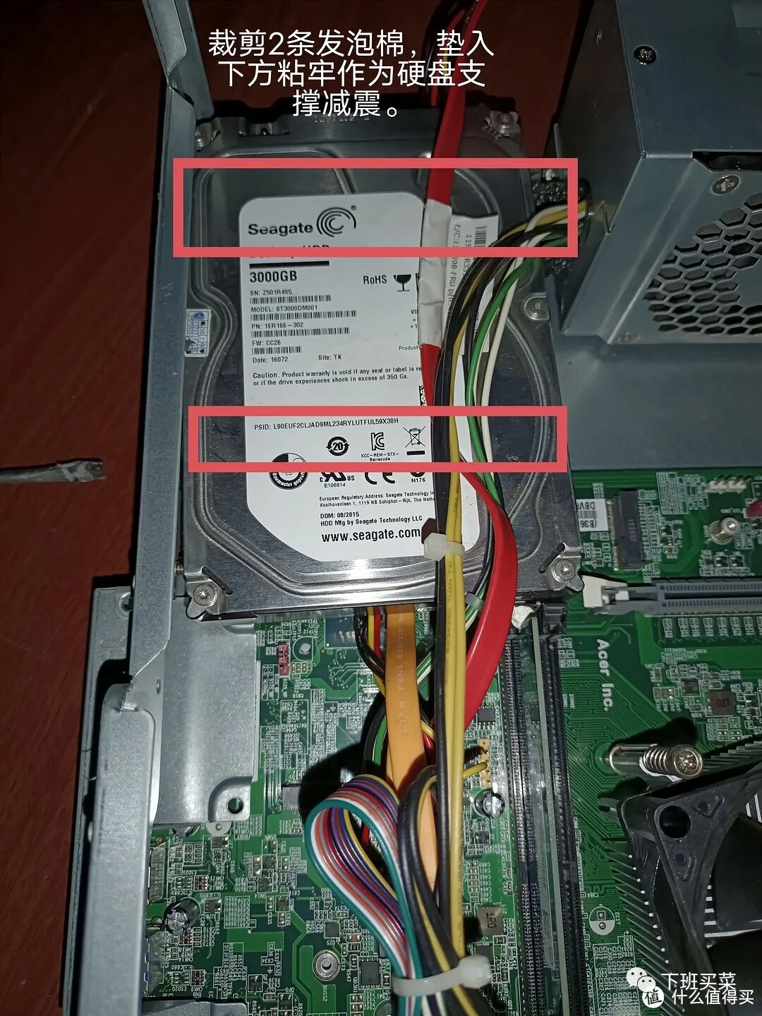 哈哈!车到山前必有路,船到桥头自然直。小主机的硬盘支架下方恰好能再塞入一块3.5寸硬盘。我试了试接入数据线和电源线也不产生干涉,但硬盘会压到主板。这小问题难不倒我,接下来一顿操作猛如虎,家人们!千万不要模仿。先将硬盘底部垫入发泡棉(图片红色框下方)这样就不会压到主板,然后在机箱散热孔处拧入一颗螺丝固定,另外一侧只能靠发泡棉顶在电源壳。虽然能用但是风险极大,还好这是个卧放式小主机不用立起来。