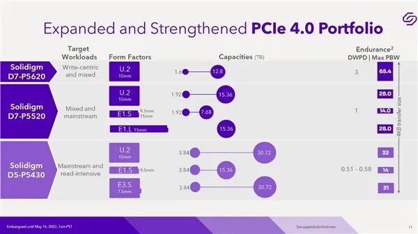 它上边还有面向混合读写应用的D7-P5520,可以每天1次全盘写入,但最大容量只有7.68/15.36TB。