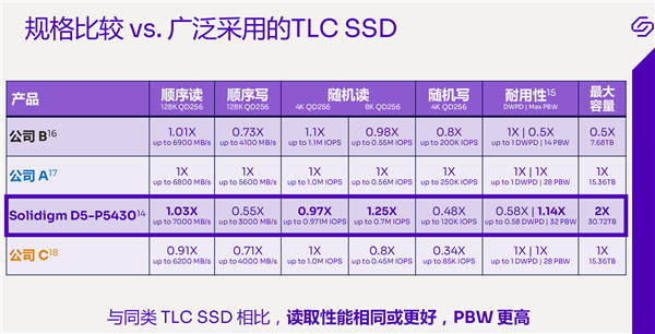对比友商同类型的TLC SSD,从标称规格来看,D5-P5430的读取性能基本相当甚至更好,写入性能基本只有一半,但还有着更大的容量、更高的数据写入量。